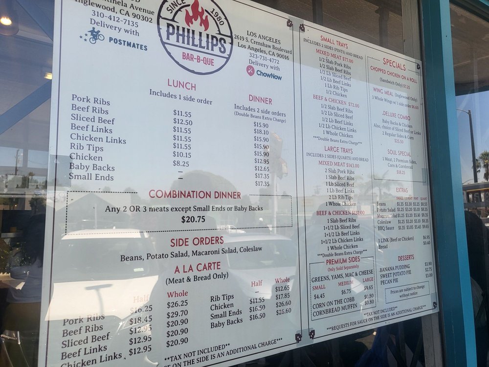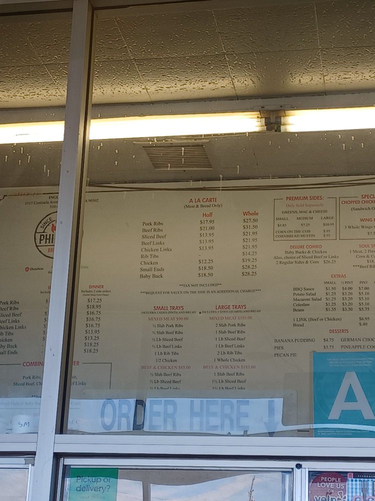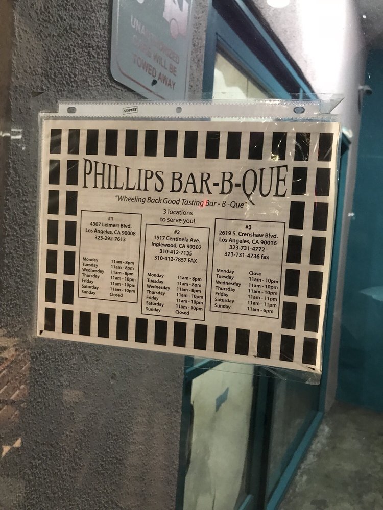 Introducing Phillips Bar B Que, a beloved barbecue joint in Inglewood, CA, offering a wide range of mouthwatering options. From pork ribs to beef links to chicken, their menu caters to every barbecue lover's craving. Customers rave about the authentic wood-smoked flavor, with meats boasting a perfect smoke ring. Reviews highlight the delectable rib tips, chicken links, and sliced beef, paired with classic sides like macaroni salad and baked beans. The friendly service and clean atmosphere add to the overall dining experience. While there is no dine-in option, the convenience of takeout and pickup orders makes enjoying their delicious BBQ easy. Make sure to call ahead for party trays or holiday hours. If you're in the mood for flavorful, juicy, and authentic barbecue, Phillips Bar B Que is the perfect choice.